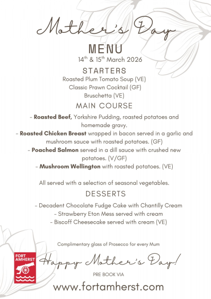 Delight your Mum this Mother's Day weekend with either a scrumtious breakfast fit for a queen or a beautifully, delicious homemade three course menu, nestled in the historical grounds of Fort Amherst.